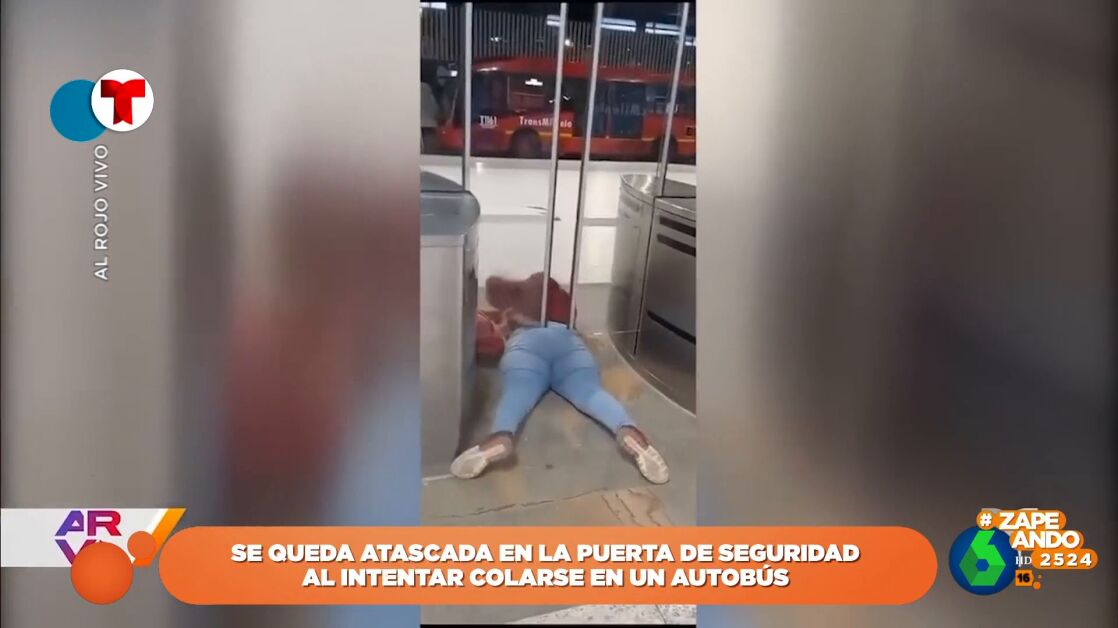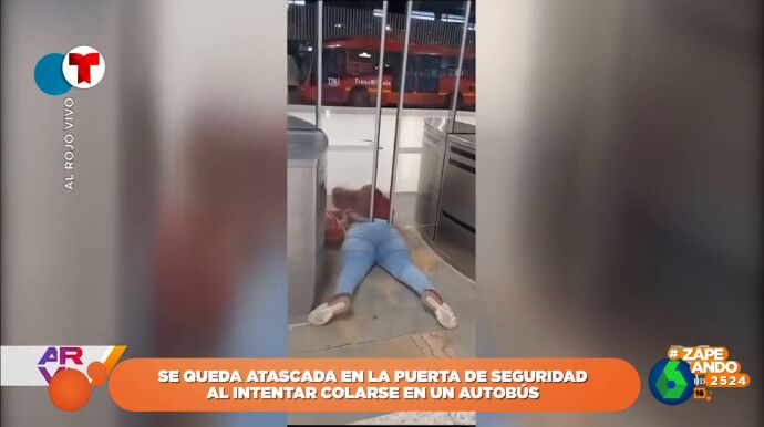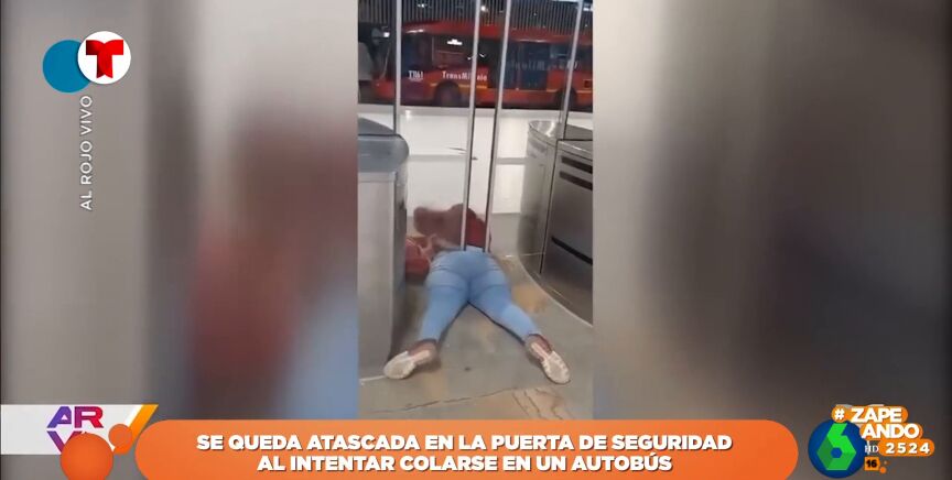 Una mujer intenta colarse en el autobús reptando por debajo de las puertas de seguridad por las que se accede a las dársenas, pero se queda atascada porque el hueco es demasiado pequeño.