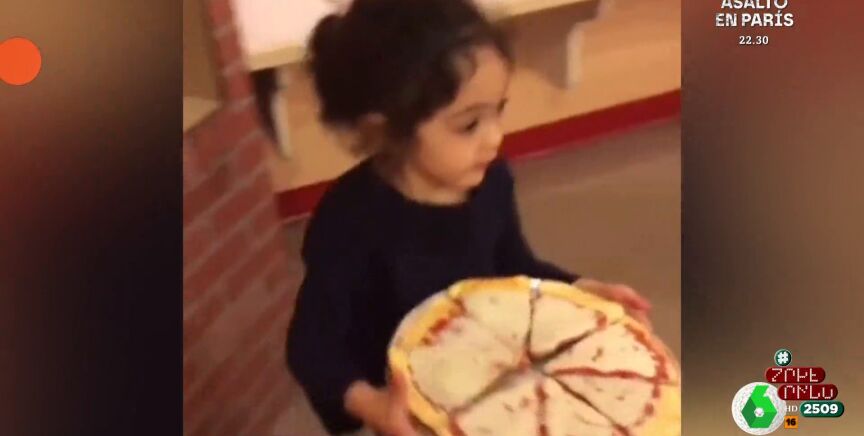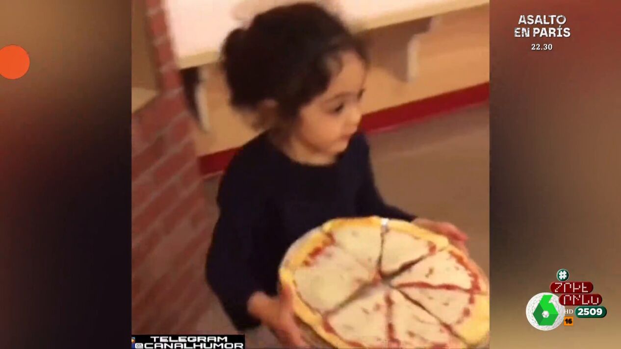 Al llegar hasta la encimera, la pequeña se dispone a dejar la bandeja con la pizza pero, aparentemente, se tropieza y termina cayendo al suelo lo que provoca, por añadidura, que todas las porciones de pizza terminen volando fuera de la bandeja.