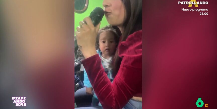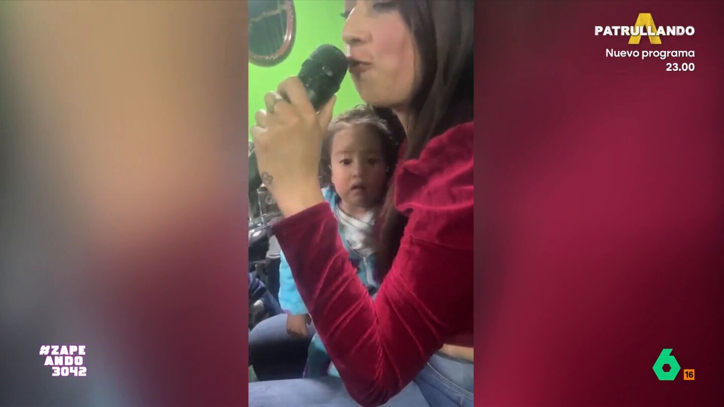 La madre comienza a cantar 'Besos y copas' con la niña en brazos, pero su manera de hacerlo no es del agrado de la pequeña.