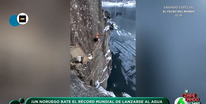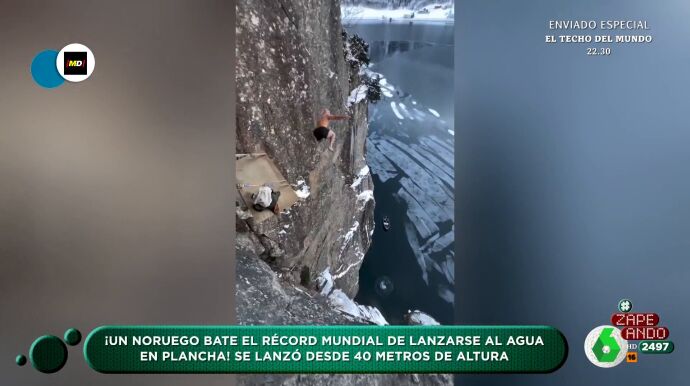 "Eso es hielo, ¿no? Está saltando a qué agua... que no se está tirando en Torrevieja", comenta Quique Peinado, y advierte: "Niños, niñas, esto no lo hagáis en casa". El protagonista se llama Ken Stornes y ha impactado con el agua a 100 kilómetros por hora.Este deporte, conocido como 'døds', que significa muerte en noruego, consiste en lanzarse al agua al estilo en plancha desde alturas de los 10 a los 14 metros y a mayor panzazo, más puntos. "Sobrevivir da puntos", indica el zapeador. Berta Collado expresa que ella invalidaría este récord porque "no ha dicho la frase que se dice en estos casos: ¡Mamá, mira!".