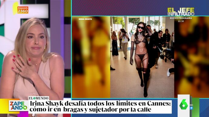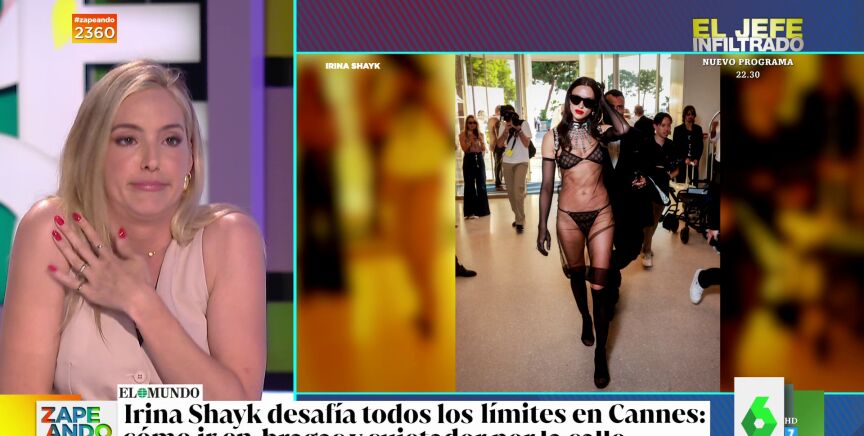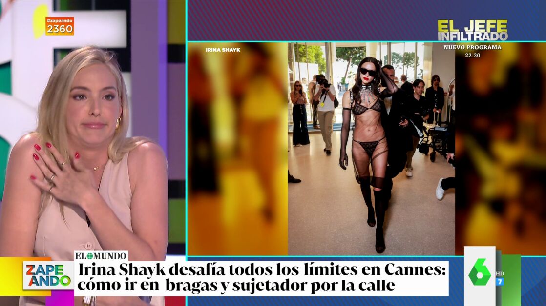 Hemos visto outfits de todo tipo, pero lo de Irina Shayk en Cannes es de otro planeta: "Es una Diosa absoluta", expresa Dani Mateo en Zapeando. Y, es que, la actriz se ha sumado a la moda 'no pants', que consiste en ir sin falda ni pantalón, por lo que escogió un "naked dress" de Gucci combinado con un conjunto de lencería transparente para brillar en la fiesta de la marca Chopard.