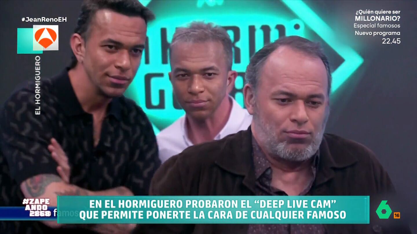 Zapeando analiza en este vídeo la visita del actor Jean Renó a 'El Hormiguero', donde probó con Marron y Pablo Motos una aplicación de inteligencia artificial capaz de ponerles la cara de Brad Pitt, Tom Hanks o Mbappé en tiempo real.