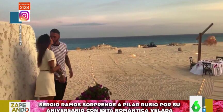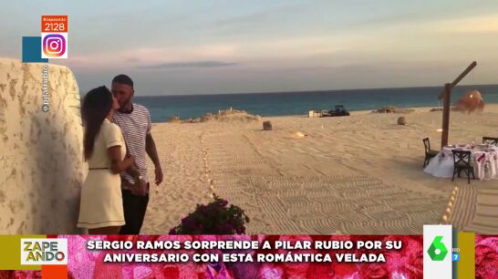 Pilar Rubio y Sergio Ramos están celebrando su tercer aniversario de boda como "solo los ricos y famosos saben hacer", destaca Dani Mateo, "con unas vacaciones de lujo en México". Pero, por si fuera poco, el exfutbolista del Real Madrid preparó una romántica velada para sorprender a su chica, poniendo así "la guinda al aniversario", tal y como señala Valeria Ros, que no puede contener la emoción al describir la idílica cena "frente al mar, rodeados de velas y con felicitación escrita en la arena" que ambos disfrutaron.
