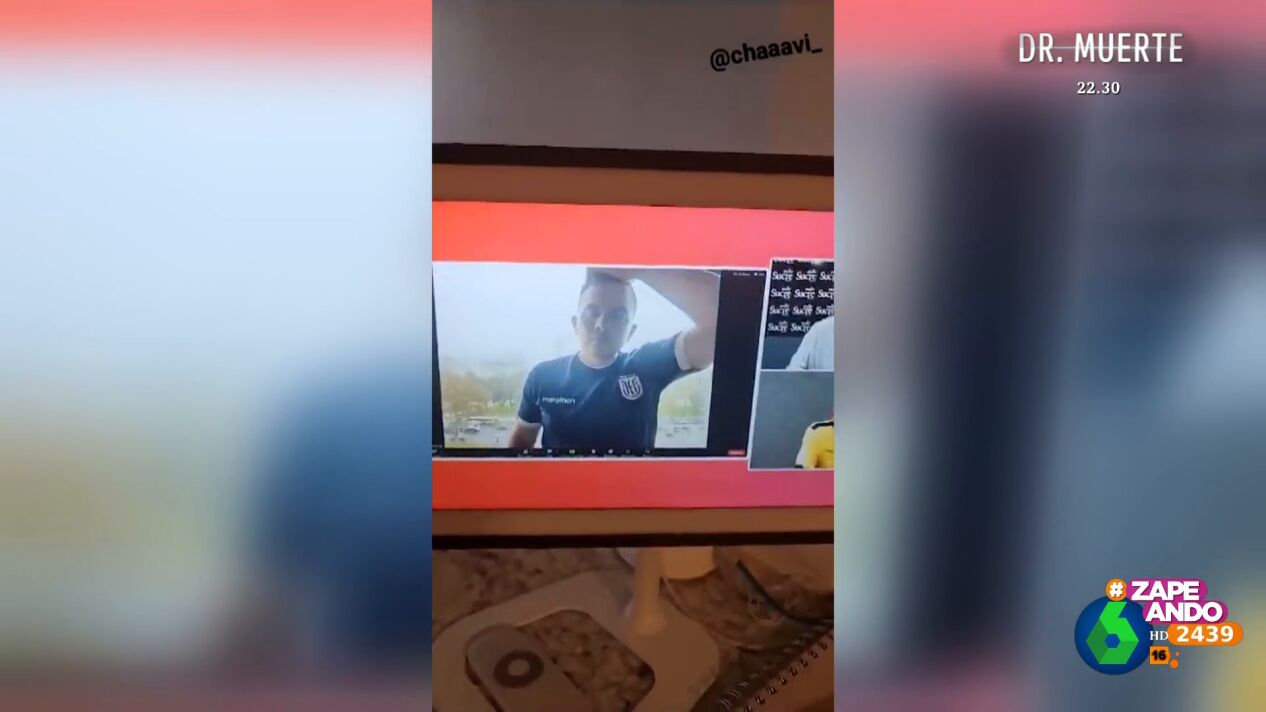 El periodista ecuatoriano Juan Francisco Rueda conecta por videollamada con su programa para comentar el partido entre Argentina y Ecuador, cuando, por error, cambia la cámara y muestra que no está solo en la habitación.