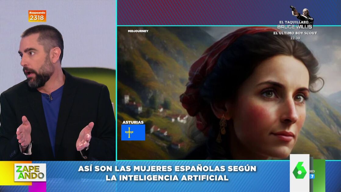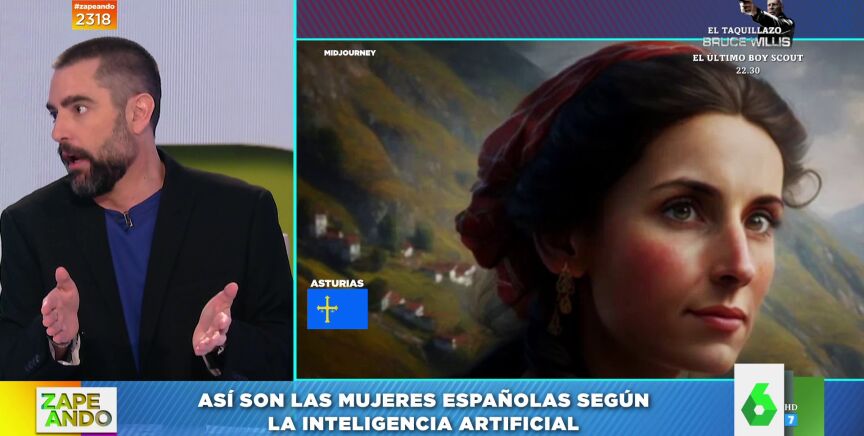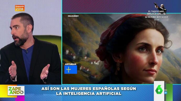 "Comenzamos con una polémica provocada por la inteligencia artificial", anuncia Dani Mateo a sus compis de Zapeando, a los que muestra las representaciones que ha hecho la IA de las españolas, a las que ha retratado de formas diferentes en función de la región a la que pertenecen. "A la mujer asturiana la ve un poco comunista", observa el catalán.