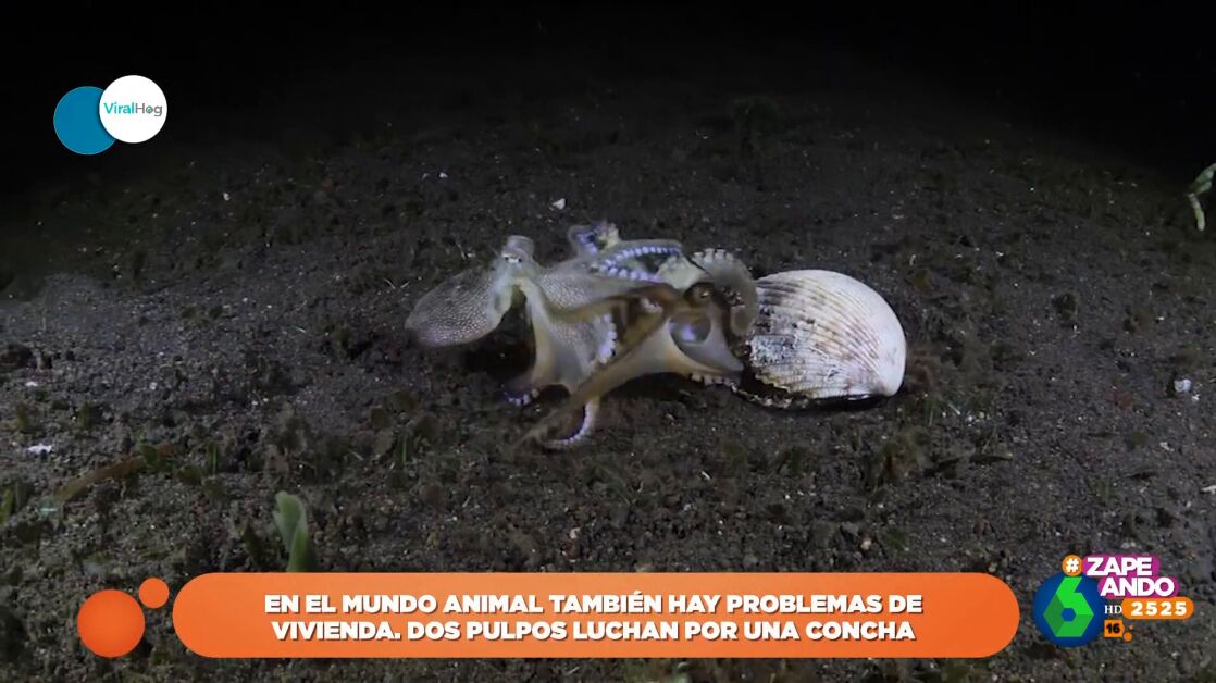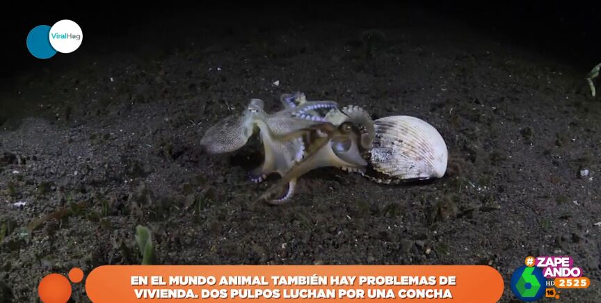 Pero, ¿cuál es el origen de esta batalla marina? Ni el amor de una "pulpa" o la comida. Su reyerta tiene su origen en algo tan simple como una concha. Como se ve en las imágenes, uno de los pulpos está en el interior de la concha y sale de la misma para defender su propiedad ante el otro cefalópodo.