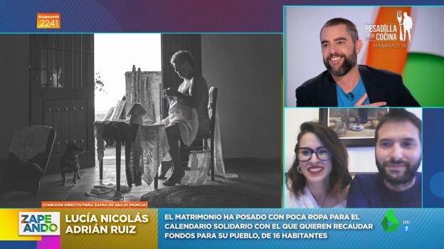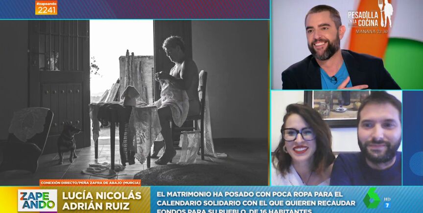 Zapeando conecta en directo con Lucía Nicolás y Adrián Ruiz, la pareja impulsora del calendario solidario de Peña Zafra de Abajo, Fortuna, Murcia. "¿Cómo surge la idea?", les pregunta Dani Mateo, y ellos explican que "surgió a raíz de una exposición". "Los vecinos decidimos hacer nuestro calendario y arrastramos a otras diez personas que faltaban para completar los doce meses", comenta Lucía, que explica que en él quisieron representar "escenas típicas del mundo rural y de su pedanía en concreto".