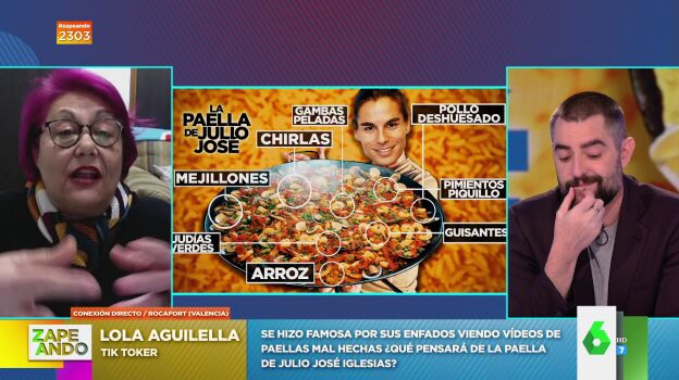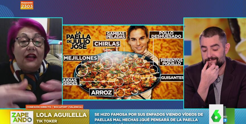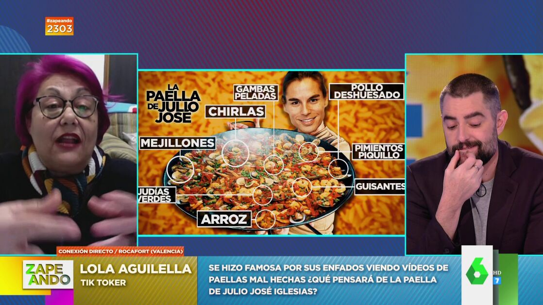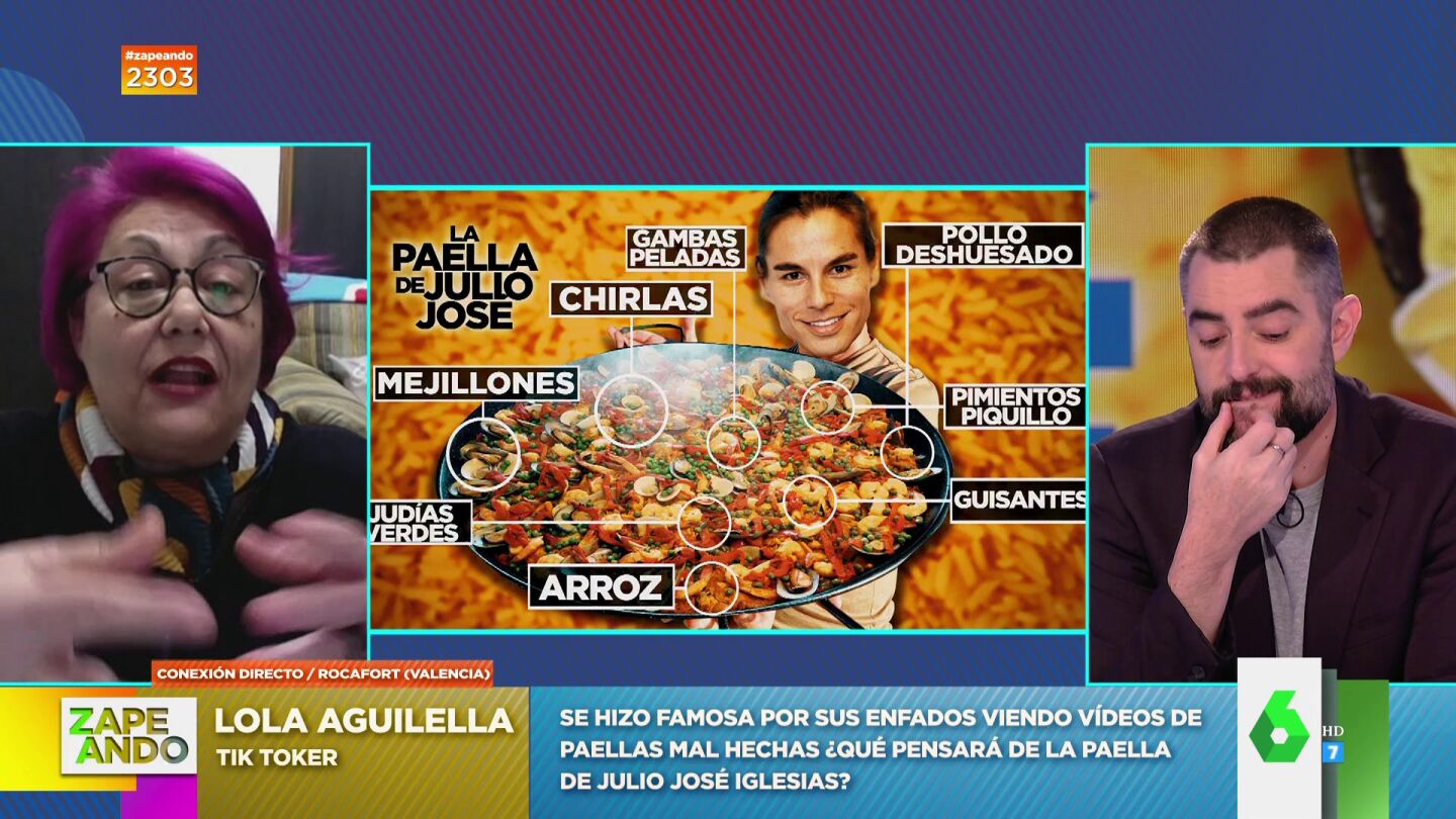 Zapeando conecta en directo conLola Aguilella, la tik toker que se ha hecho famosa por criticar vídeos de paellas mal hechas. En esta ocasión le toca comentar la que se sirvió en el cumpleaños de Julio José Iglesias con ingredientes tan dispares como "mejillones, chirlas, pollo deshuesado, gambas, guisantes, judías verdes, pimiento de piquillo y granitos de arroz": "El pelo azul se me ha pasado a fucsia", espeta provocando las risas en plató.