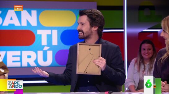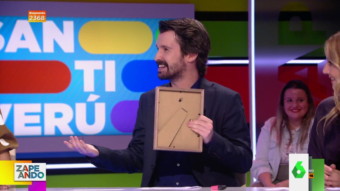 Santi Alverú visita el plató de Zapeando y lo hace con algo entre las manos. "He visto lo que llevas y tu puesto pende de un hilo", le advierte Dani Mateo nada más sentarse a la mesa, a lo que el colaborador se defiende: "Un tipo me ha dado esto y yo lo he cogido", asegura él, que explica que prefiere dejarlo sobre la mesa por si regresan a por él.