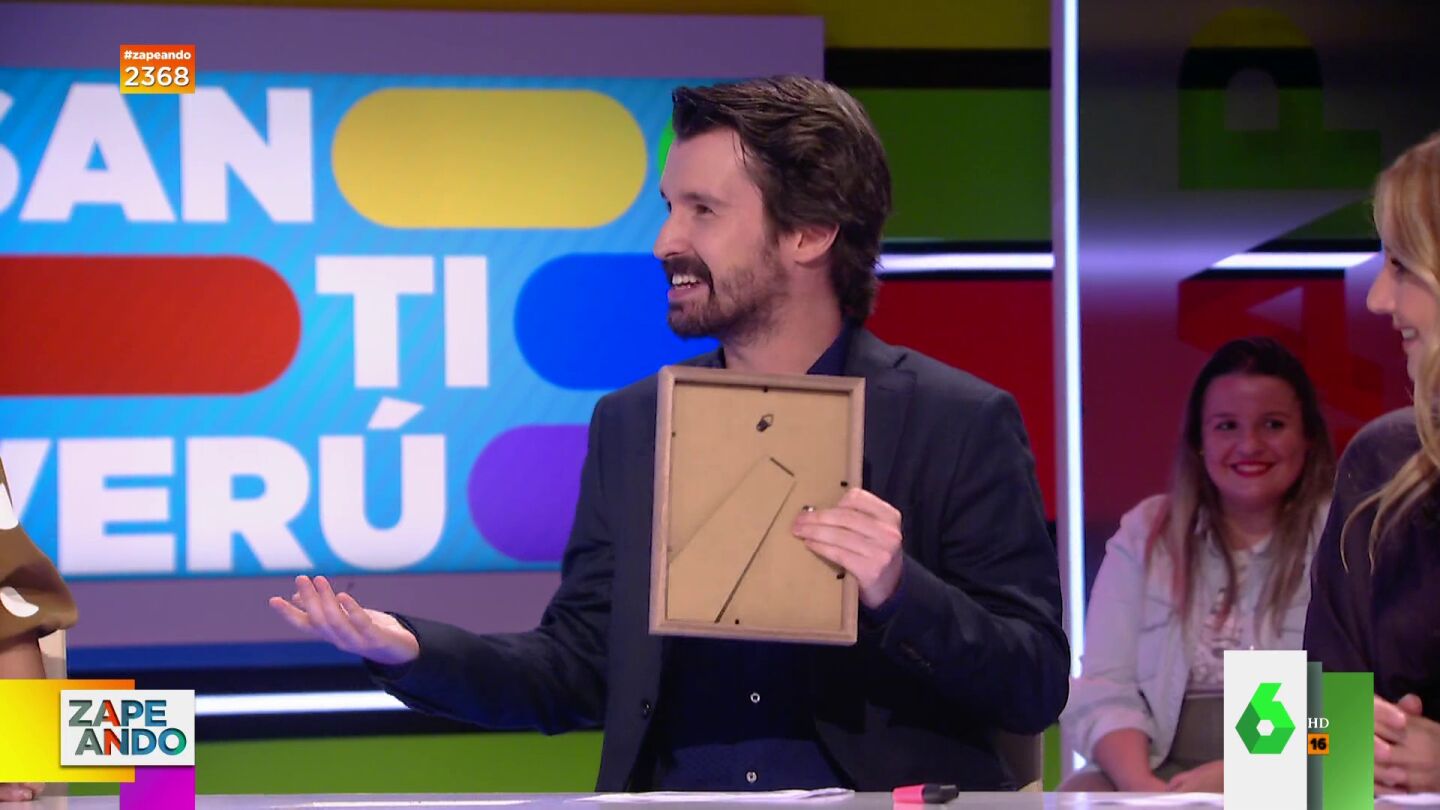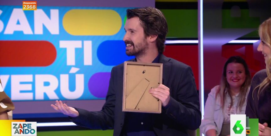 Dani Mateo no puede evitar reparar en la foto que Santi Alverú trae enmarcada, que no es otra que la de su graduación: "Tu puesto pende de un hilo", le advierte si se atreve a mostrarla una vez más a cámara. Este es el momentazo que protagonizan.
