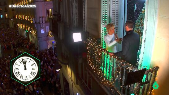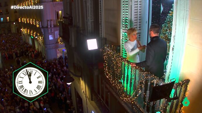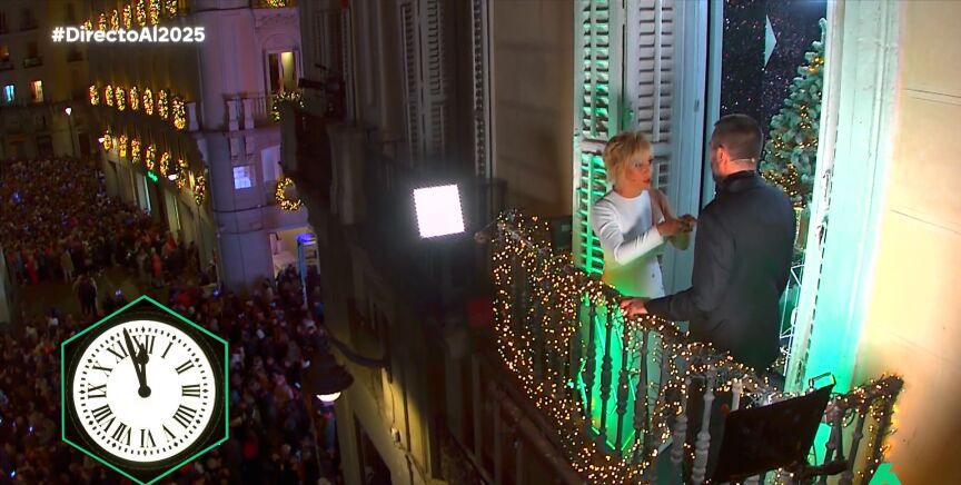 Haciendo gala de su habitual sentido del humor, el presentador de Zapeando bromeaba con el cartel que se alzaba sobre el reloj de la Real Casa de Correos. "Tengo que decirte que son 15.000 personas las que hay hoy en la Puerta del Sol y que este año va a haber una novedad, que lo sepas: cuando acaben las campanadas, han cambiado el cartel, que pone 'feliz 2025'", informaba Pardo.