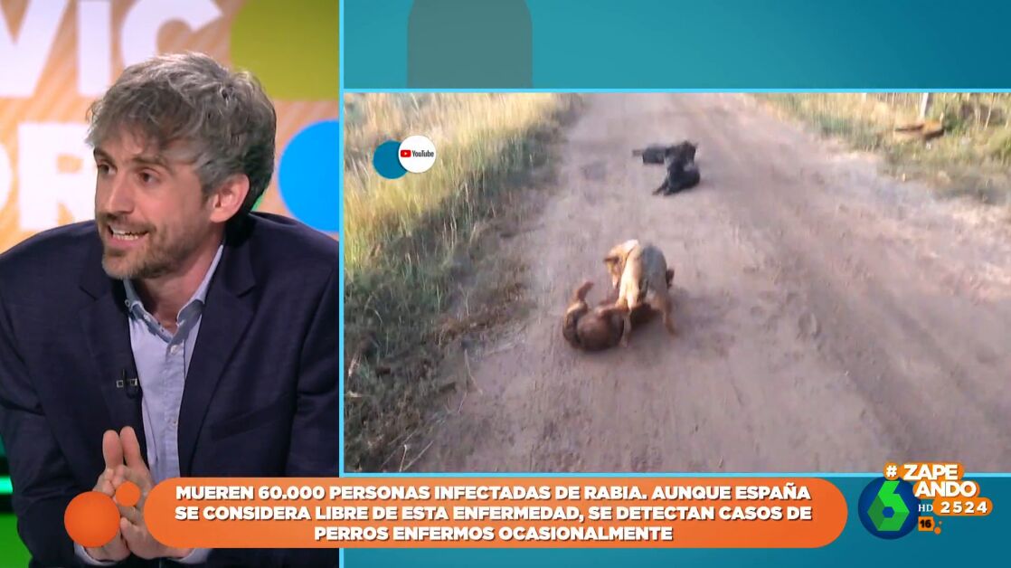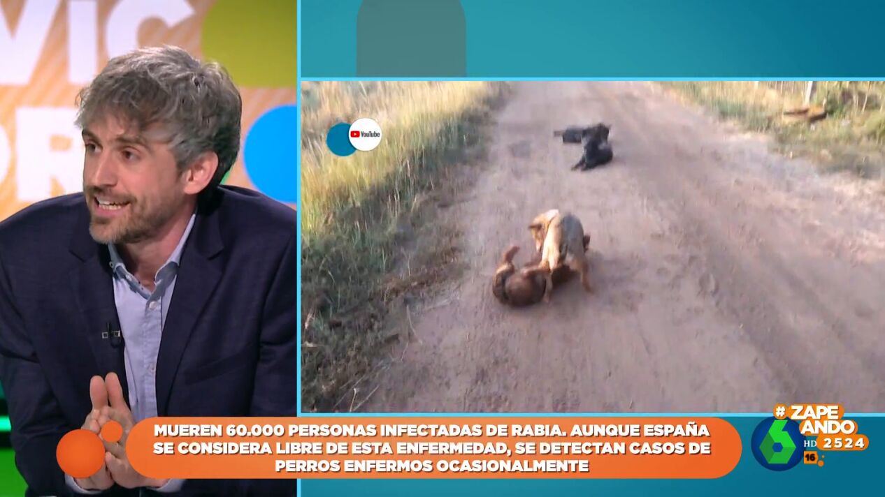 El veterinario Víctor Algra ha hablado en Zapeando sobre las zoonosis, un grupo de enfermedades que son transmitidas de los animales a los humanos. Una de las más conocidas es la rabia, "una de las zoonosis más importantes", como indica el veterinario. La rabia mata cerca de 60.000 personas en el mundo aunque, por suerte, en nuestro país esta enfermedad está erradicada.