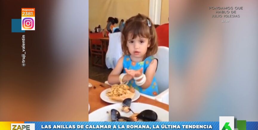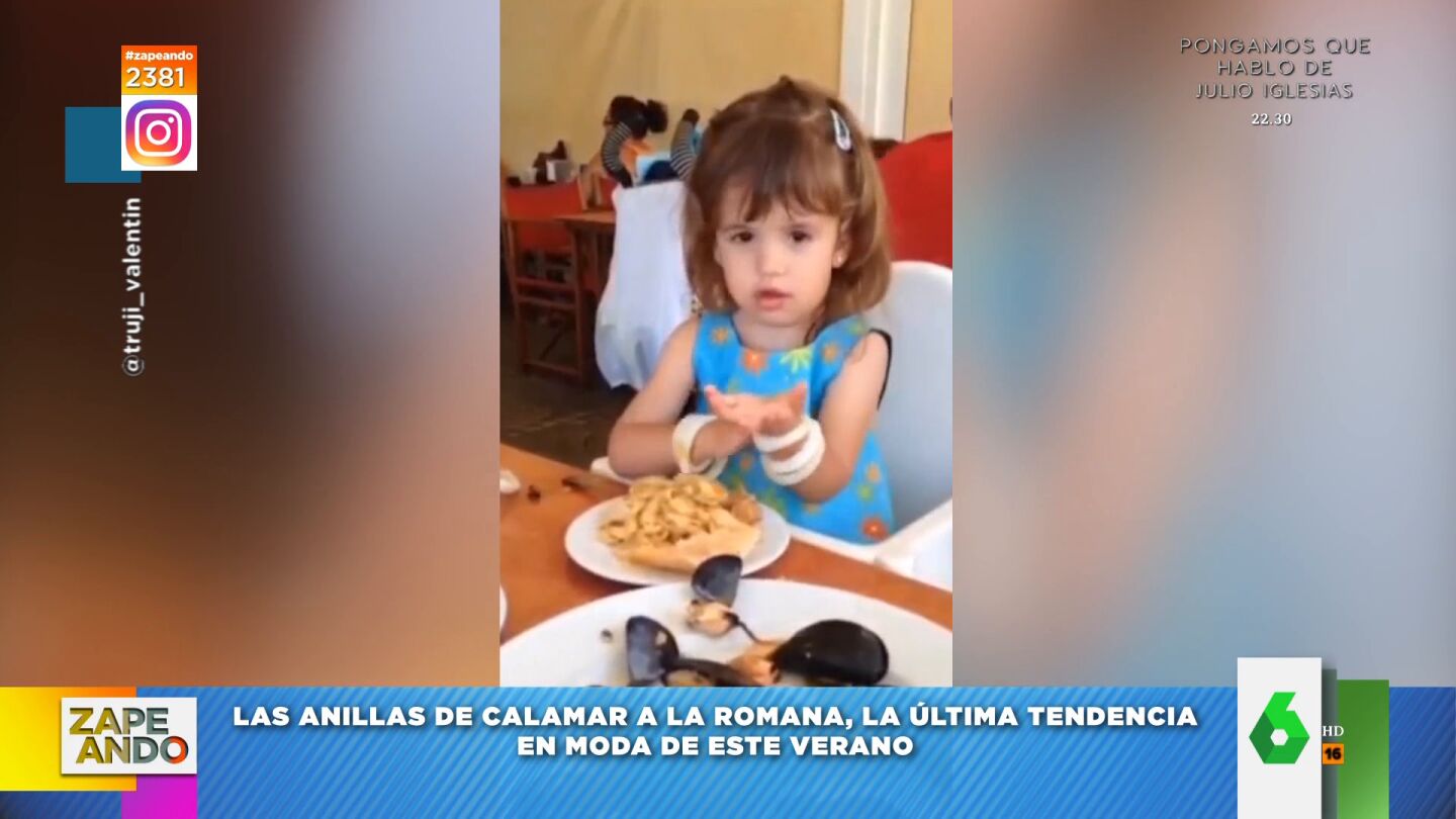 Utiliza calamares a la romana y, tras retirar pacientemente el rebozado de cada una de las anillas, se las pone en el brazo como si fueran pulseras. "¡Qué fantasía!", comenta el zapeador, que apunta que "te quedan unos brazos preciosos y que te huelen fenomenal".