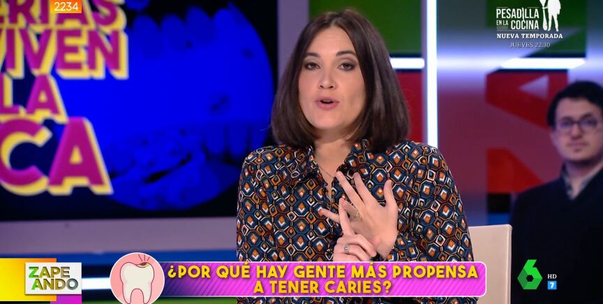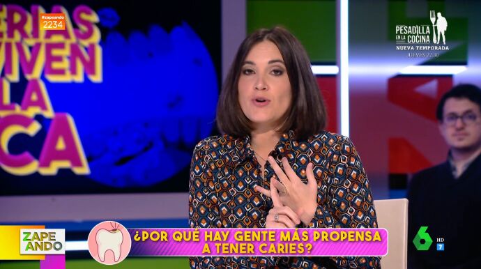 Boticaria García visita el paltó de Zapeando y se somete a las preguntas que tienen los colaboradores sobre las caries. "¿Por qué hay gente más propensa a tener caries?", se interesa Miki Nadal, a quien responde que esto depende "de la microbiota oral, de la genética mucho y de la edad porque a lo largo de los años se va modificando en función de lo que comemos, si tomamos medicamentos, de la higiene o incluso de si fumamos".