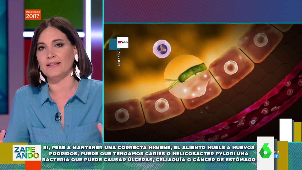 Boticaria García visita el plató de Zapeando para hablar del mal aliento. ¿Por qué hay gente a la que el aliento le huele a huevos podridos? Por ejemplo, si pese a tener una correcta higiene bucal, una persona sigue teniendo mal aliento, puede ser que tenga caries o helicobacter pylori, una bacteria que puede causar úlceras, celiaquía o cáncer de estómago.