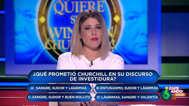 La segunda pregunta es qué prometió Churchill en su discurso de investidura. Valeria duda y por eso recurre al 'comodín de sus amigos', ya que varios de sus amigos estaban entre el público. Sus amigos deciden que la respuesta es "sangre, sudor y lágrimas". Gracias a ellos, obtiene un punto ya que es la respuesta correcta.
