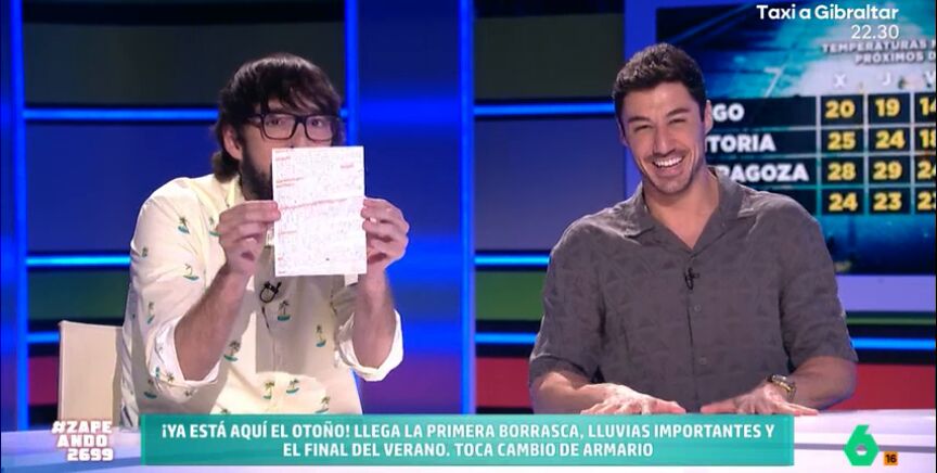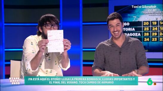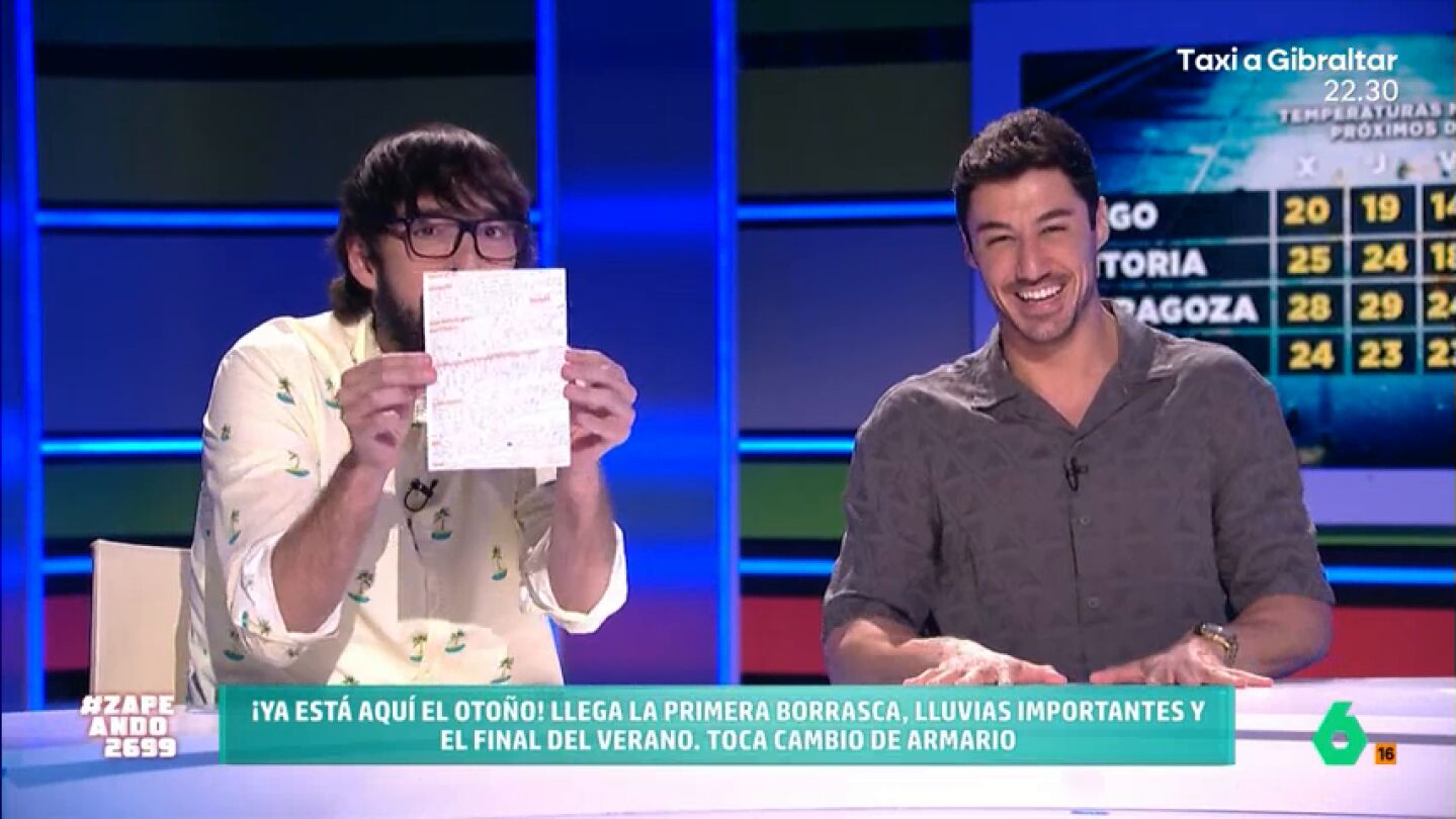 El meteorólogo de laSexta desvela cómo son sus notas para participar en el programa. Los zapeandores alucinan con su caligrafía. "Cómprate hojas milimetradas que se te va para arriba la línea", le recomienda Miki Nadal.