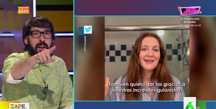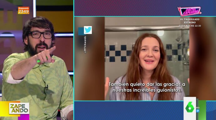 "Qué grande Drew Barrymore acordándose de los guionistas, que son fundamentales en los programas", lee Miki Nadal en el Autocue de Zapeando, lo que provoca su inminente reacción: "¿Quién ha escrito esta chorrada?". "Tiene toda la pinta de Amando", espeta, por su parte, Dani Mateo.