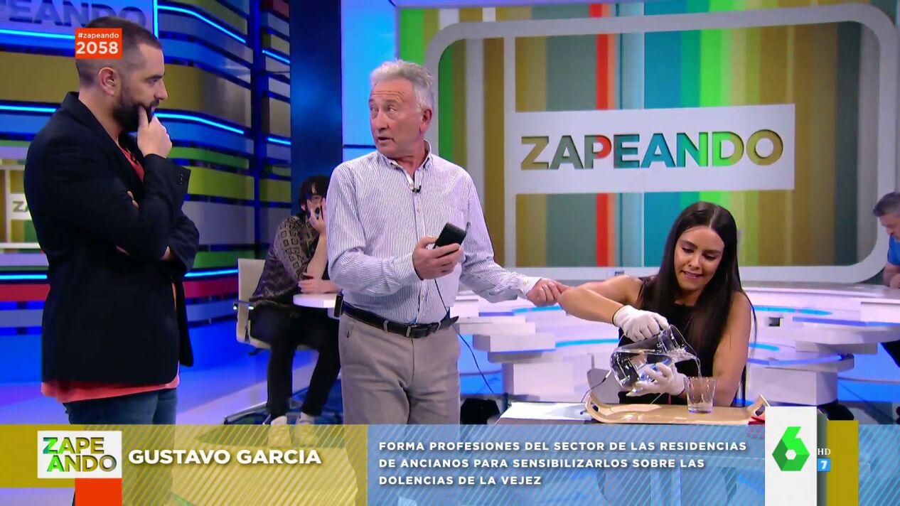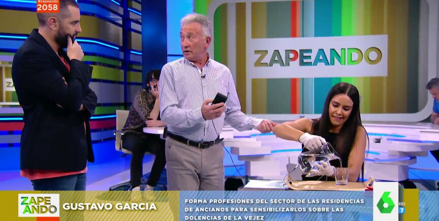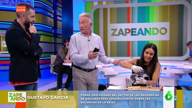 Cristina Pedroche ha experimentado en directo en el plató de Zapeando las dificultades que tienen las personas mayores que sufren temblores para realizar actividades cotidianas. "Se va a poner unos guantes que van a producirle un temblor. Es uno de los problemas que puede tener una persona mayor. Con ello, es muy difícil hacer cualquier tarea cotidiana, como beber un vaso de agua", ha señalado Gustavo García, quien forma a profesiones del sector de las residencias para sensibilizar sobre las dolencias de los mayores.