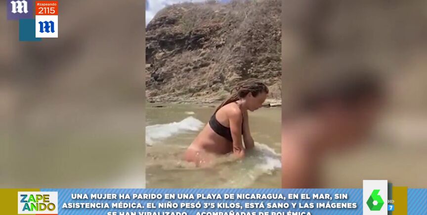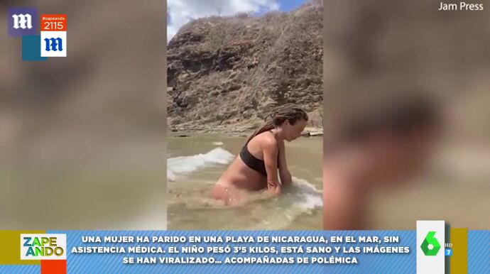 "¿Nos iríamos a una playa de Nicaragua para parir?", pregunta Cristina Pedroche al resto de la mesa de Zapeando justo antes de mostrarles el vídeo viral de una mujer que ha dado a luz, en el mar y sin asistencia médica, a un niño que ha pesado 3,5 kilos. "Si alguien va a esa playa y ve algo flotando, que no se asuste: no es una medusa, es un trozo de placenta", comenta la zapeadora.