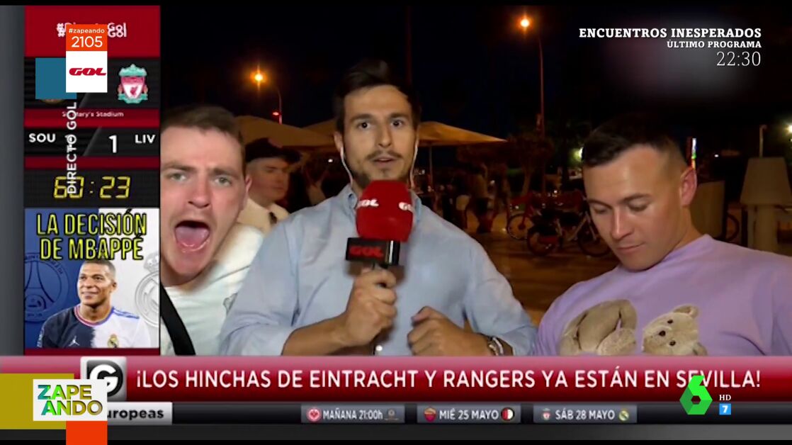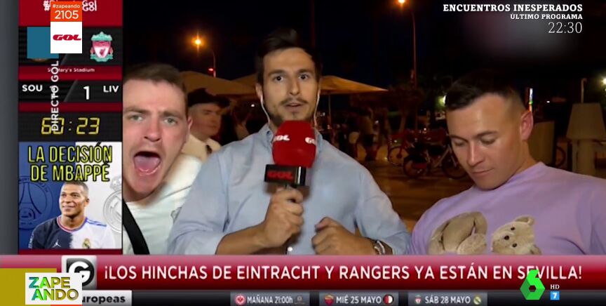 Manu Pedrero, un reportero de Gol que cubría la fiesta previa a la final de la Europa League, que enfrentaba al Eintracht de Frankfurt contra los Glasgow Rangers, en Sevilla; "vio algo que tardará en olvidar", describe Miki Nadal a sus compis de mesa. Y, es que, "uno de los aficionados reventó el directo sin decir una palabra". Solo le bastó bajarse los pantalones en pleno directo y mostrar su miembro al periodista, que se encontraba en plena conexión.