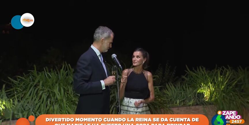 Finalmente, Felipe VI se da cuenta de lo que está sucediendo y decide compartir su copa con Letizia. "Pobrecita mía, que la han dejado colgada", no puede evitar destacar Dani Mateo al ver este vídeo viral.