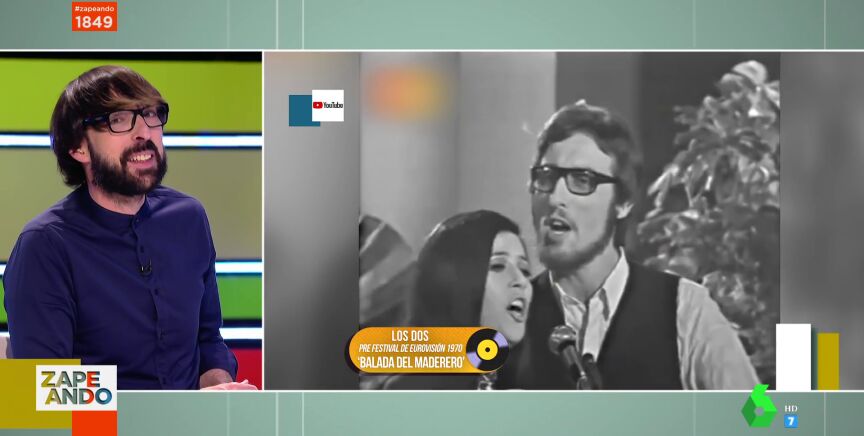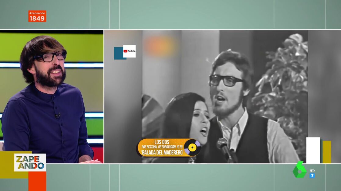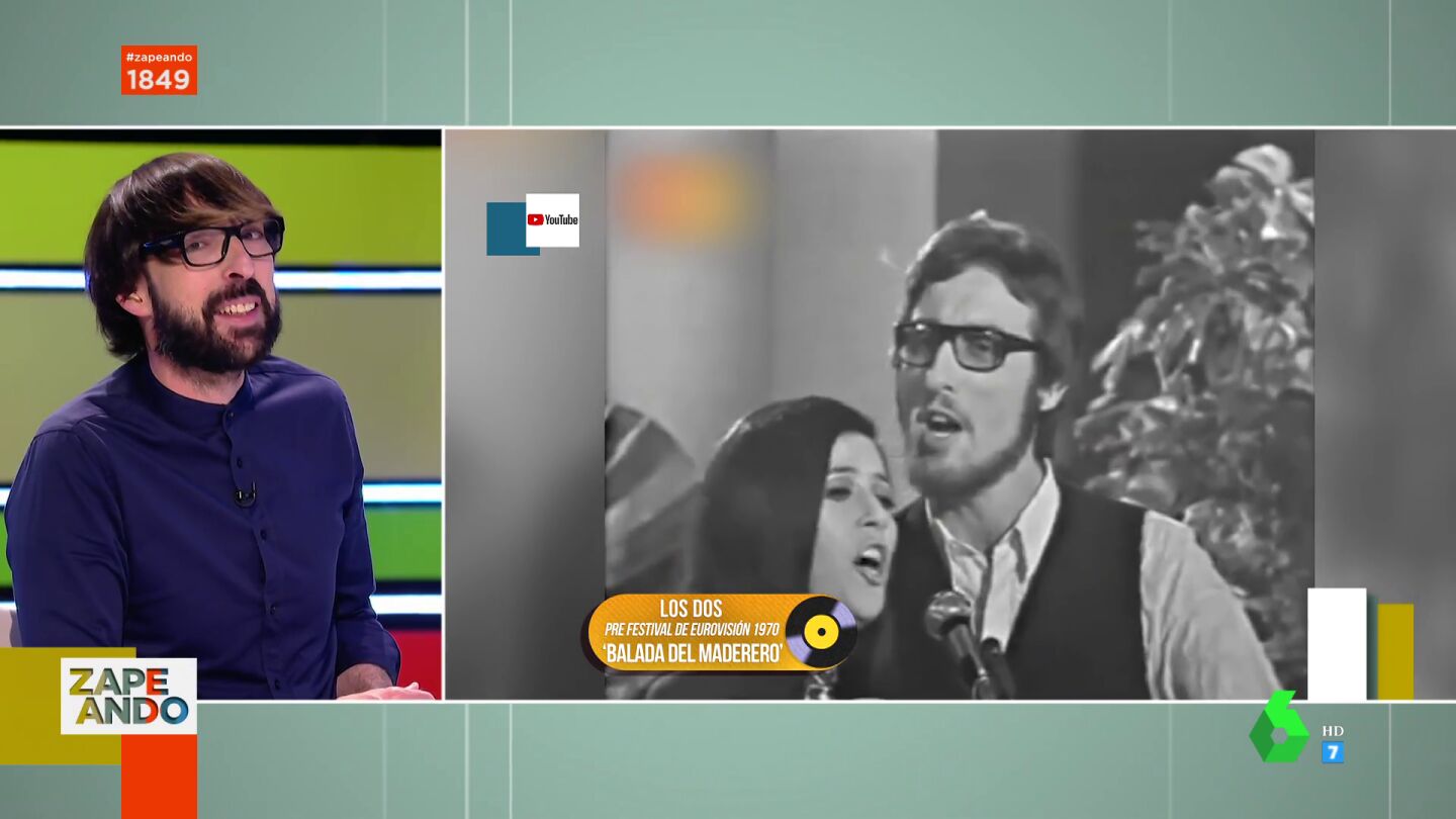 Renata Zanchi plantea a los zapeadores preguntas sobre la historia de Eurovisión, entre ellas, quién era la voz masculina del dúo 'Los Dos', que se quedó a las puertas de representar a España en 1970. La respuesta es el humorista Eugenio, con quien Renata ha encontrado un enorme parecido con Quique Peinado.