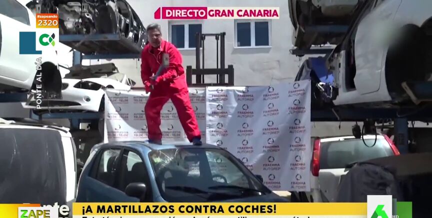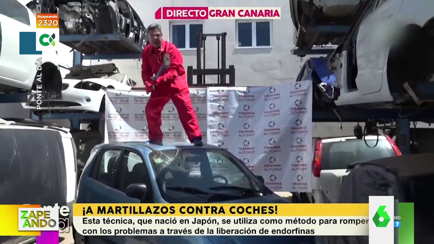 Isaías, un reportero canario, se ha vuelto viral por probar en directo la técnica japonesa. Una en la que el objetivo es destrozar a martillazos el mayor número de coches viejos para liberar endorfinas.