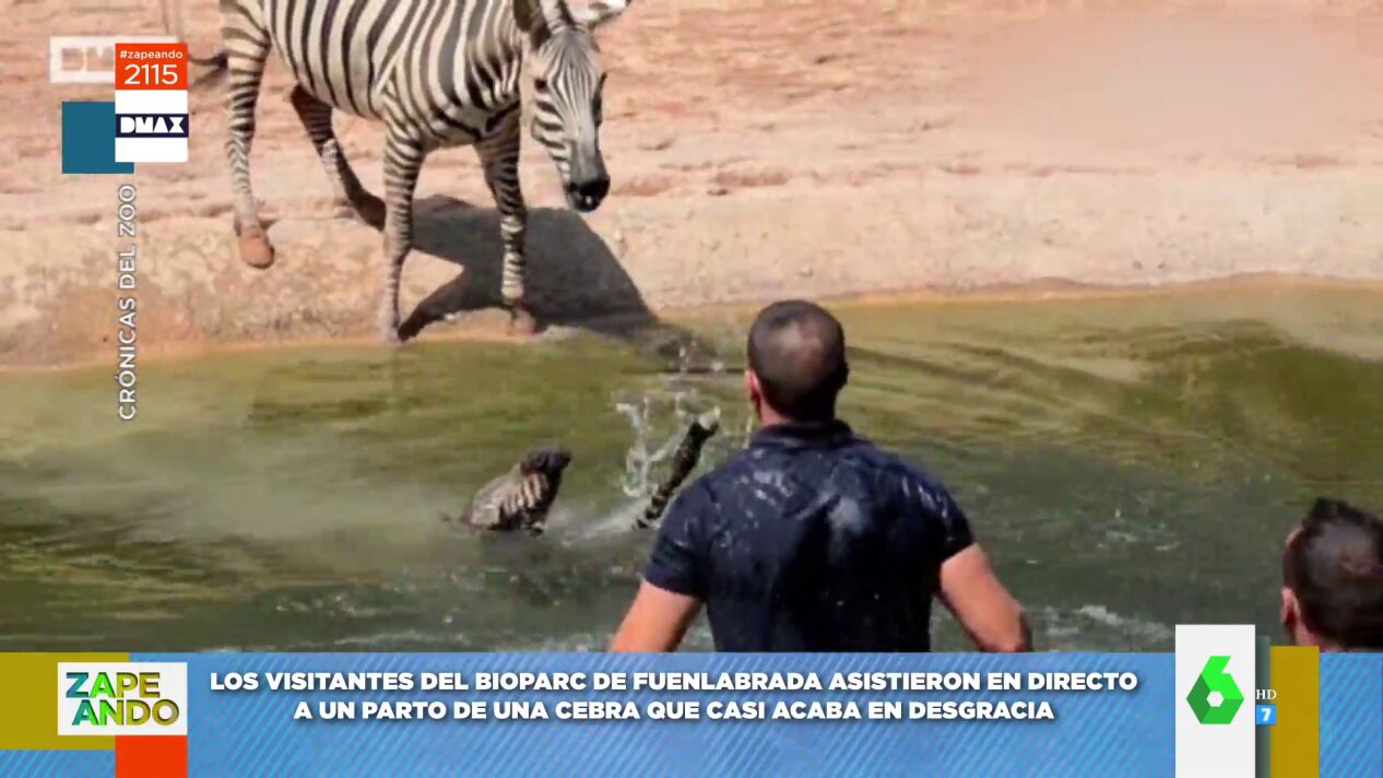 "Estos cuidadores del zoo de Fuenlabrada vivieron una situación muy tensa tras el parto de una cebra", describe Miki Nadal antes de mostrar el angustioso vídeo en el que una de las crías de cebra está a punto de morir ahogada. "Parió fuera la madre", explica uno de los cuidadores que lograron rescatarla, "nadie pensó en el peligro que corría".