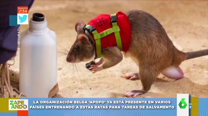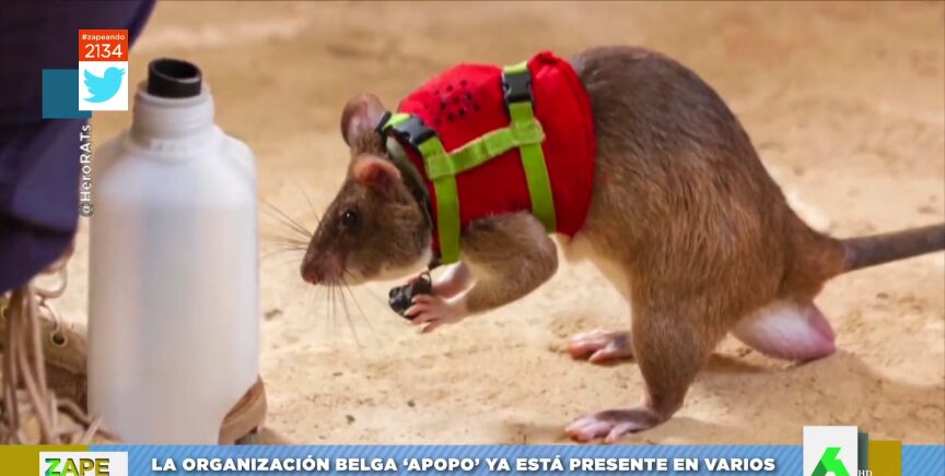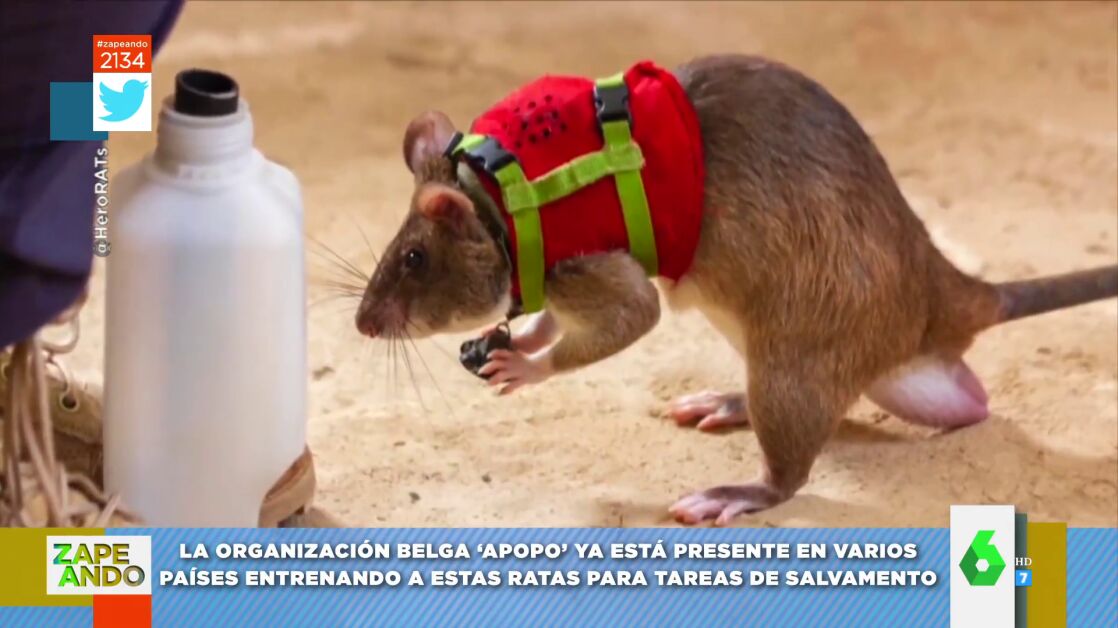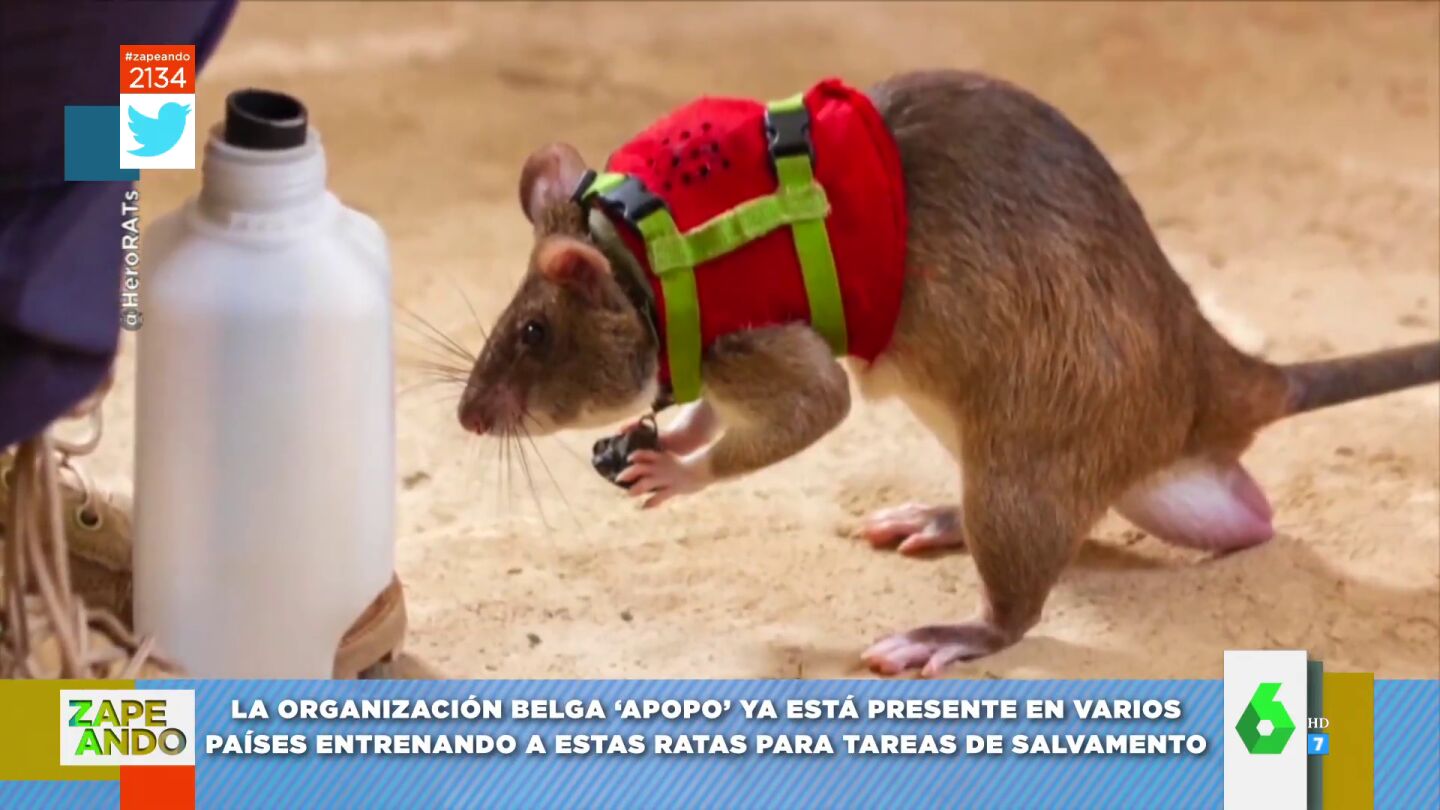 La organización belga 'Apopo' está entrenando a estas ratas para tareas de salvamento. En este vídeo de Zapeando, cómo las equipan con mochila provista de micrófono, cámara y rastreador GPS para buscar entre los restos de un terremoto.