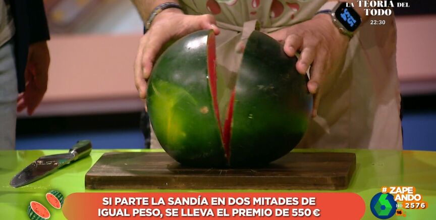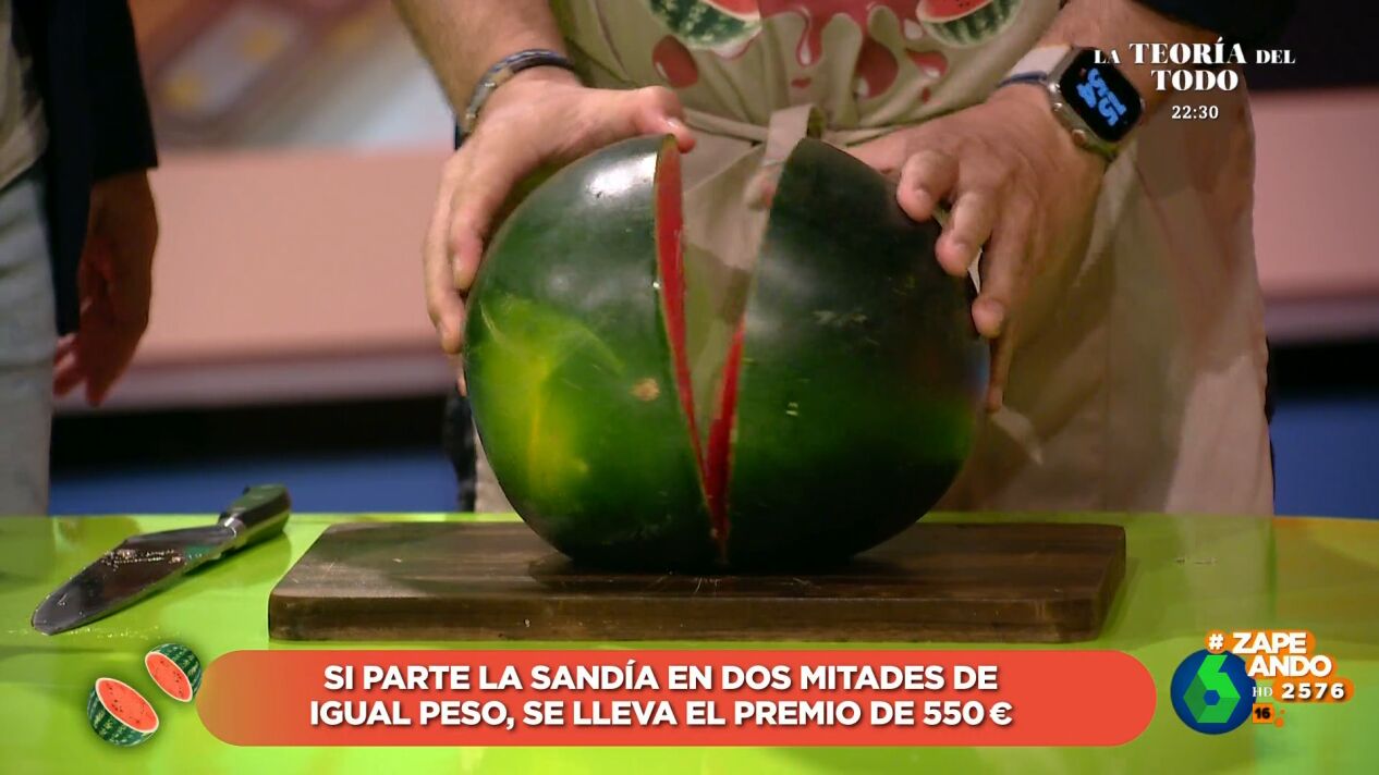 El primer trozo pesado ha arrojado un peso de 3,300 kg y, de regalo, Dani Mateo se ha salpicado con el zumo de la sandía manchando sus pantalones. La otra mitad, por desgracia para Andrés, pesaba, tan solo, 3,04 kg, lo que ha significado que no se lleve el bote, para él, y que Miki no se lleve un jamón como recompensa.