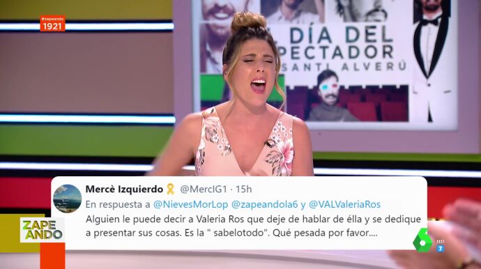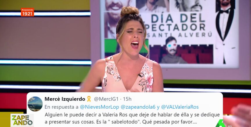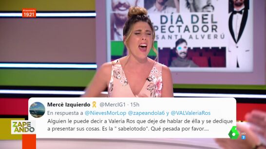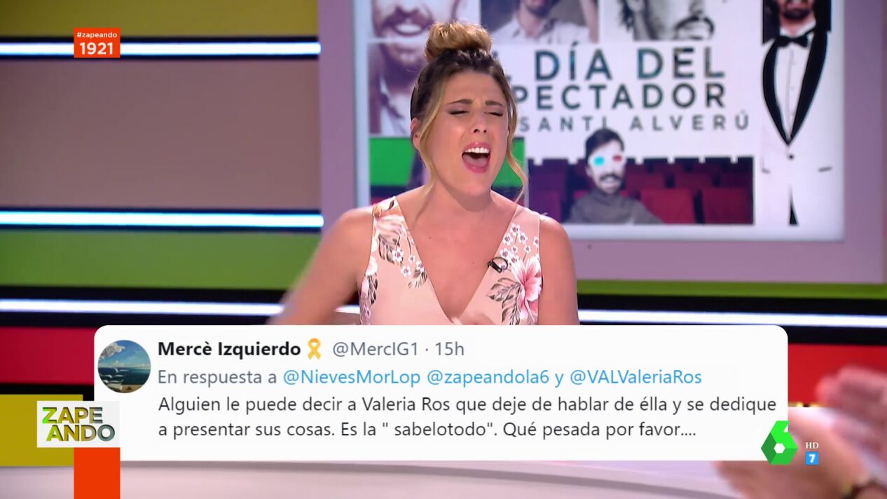 En este vídeo de Zapeando puedes cómo reacciona Valeria Ros a la crítica de un espectador que le pide que deje de hablar tanto de ella.