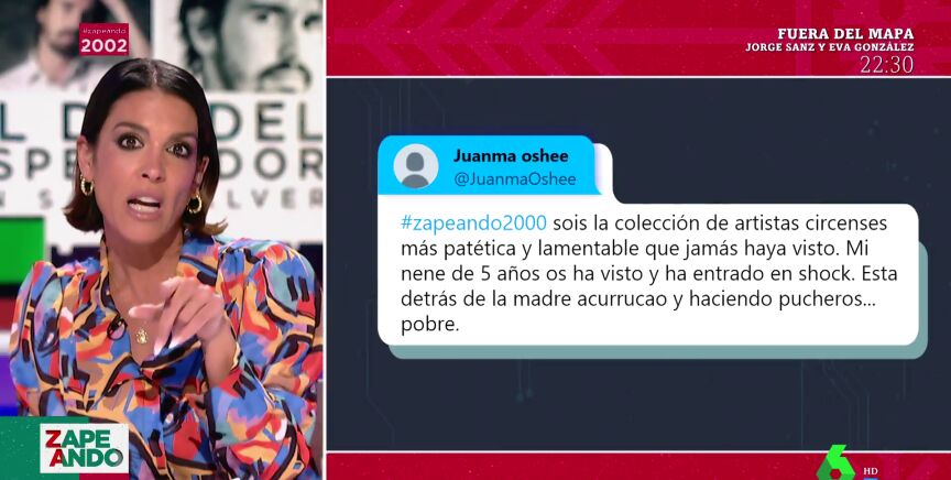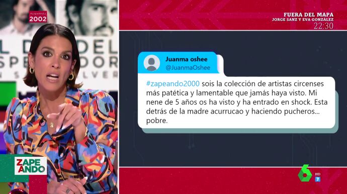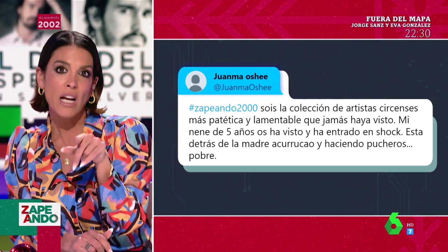 Puedes ver las reacciones de los zapeadores ante estas críticas en el vídeo principal de esta noticia, donde Lorena Castell contesta tajante a un chico que se mete con sua actuación con el aro y con el programa especial. "Juanma, cariño, tu hijo cuando sea mayor va a entrar en shock al ver las tonterías que pones en Twitter en vez de hacer cosas más importantes que poner verde a gente que se está dejando al vida para que os entretengáis", responde tajante Castell. Después de pasar a otros temas en directo, Lorena Castell ve que el hater ha puesto un mensaje en Twitter explicando que era una broma.