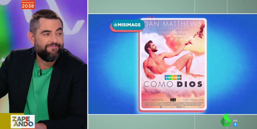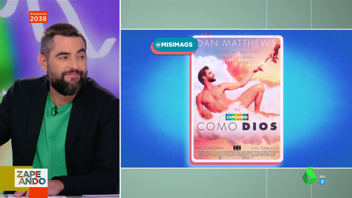 El espectador muestra varios montajes del presentador en portadas de cine como la de 'Como dios'. Una divertida imagen que hace reflexionar a Santi Alverú: "¿Qué harías si pudieras ser dios durante una semana? ya eres millonario". "Millonario es...", responde Dani Mateo, que confiesa quién de sus compañeros tiene más dinero que él.