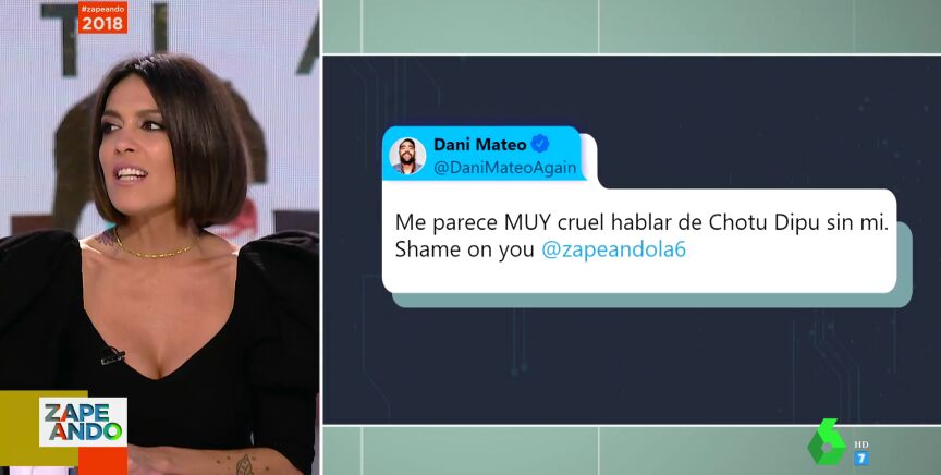 Santi Alverú muestra a Lorena Castell el tuit de Dani Mateo en el que comenta Zapeando desde su casa como un espectador más. Esta es la respuesta de su sustituta.