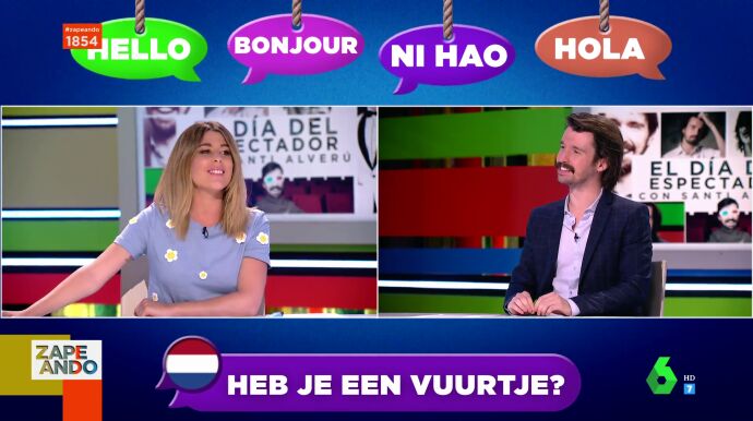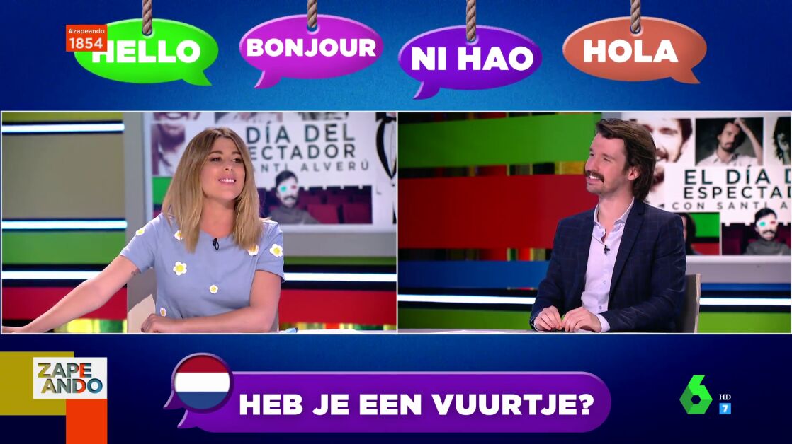 Un espectador de Zapeando lanza un reto a Valeria Ros: hablar en el plató en 10 idiomas diferentes. Un 'challenge' que la zapeadora no ha dudado en aceptar y que ha llevado a cabo con su ya mítica frase "do you have a lighter?". Una frase "que Valeria utiliza para ligar", según recuerda Santi Alverú.