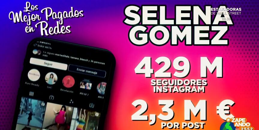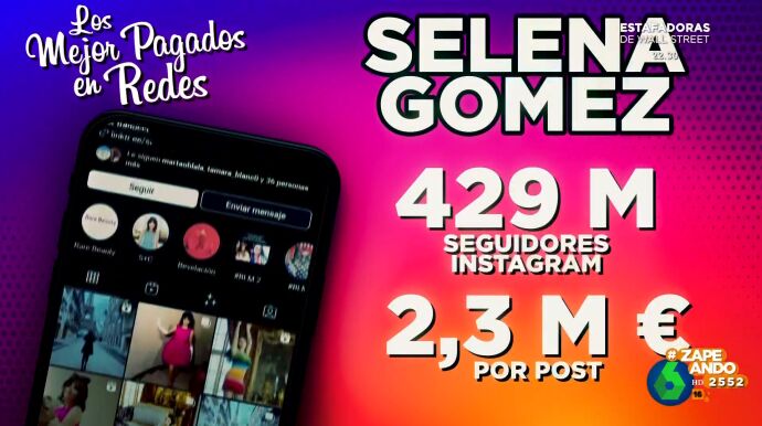 "Todos serán muy ricos pero hay algo que ninguno tendrá jamás, hipoteca, eso es lo que te da la verdadera felicidad , evitar el desahucio", apunta Valeria Ros. Pero son otros tres los que ocupan los primeros puestos de la lista. En tercer lugar se encuentra Selena Gómez. La productora, cantante y actriz tiene 429 millones de seguidores en Instagram y cobra 2,3 millones de euros por publicación.