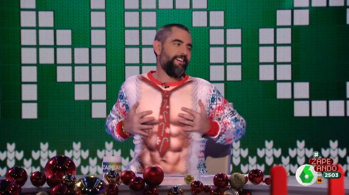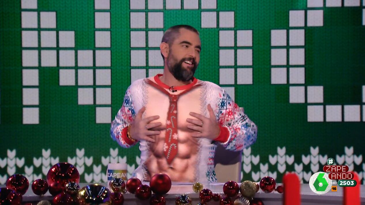 "Me ha dado un no sé qué al verme con transparencias, pero he dicho, 'si hay que enseñar el cuerpo, pues se enseña'", espeta en tono irónico Dani Mateo, que celebra en Zapeando el día del Jersey Navideño Feo.