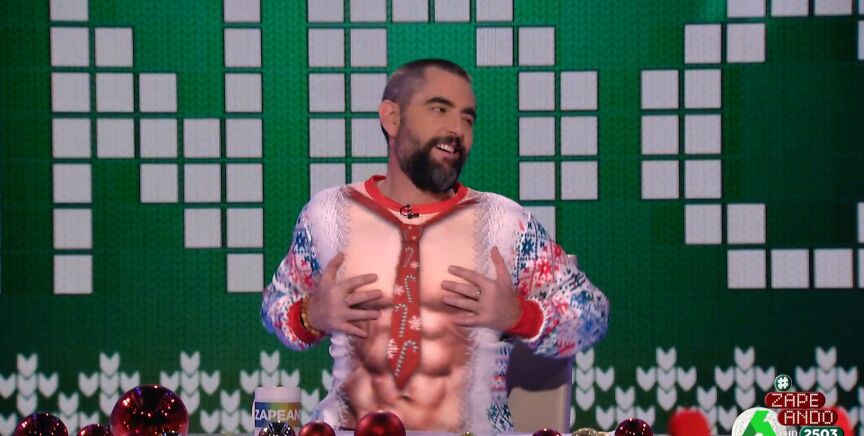 "Hoy no venimos de una despedida de soltero, sino que es el día del del jersey navideño feo", anuncia Dani Mateo nada más comenzar Zapeando, que explica por qué sus compañeros de mesa lucen estos looks tan horteras. "Y ya veis, nosotros nos hemos comprado uno ad hoc y los hemos probado antes", asegura el presentador, que ironiza con que se los han enseñado "a varios epilépticos y han muerto 3 de 5".