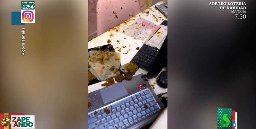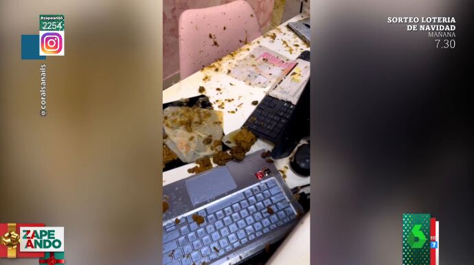 "Todo el ordenador, los aparatos electrónicos. Cada vez que caga alguien y tira de la cadena cae. Mirad cómo caen los trozos de caca. No se puede estar aquí del olor que hay. Esto es un castigo", se lamenta. "¡Qué mala suerte!", espeta María Gómez en Zapeando, que se compadece de los propietarios de este centro de estética al que le llueven excrementos, tal y como se puede ver en el vídeo principal de la noticia. "Un abrazo enorme", aprovecha Dani Mateo para mandarles ánimos.