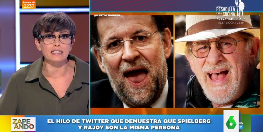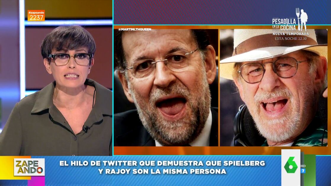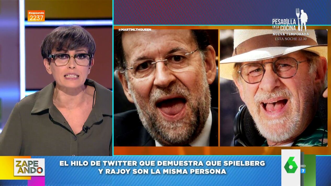 Hay un hilo en Twitter que intenta responder a la siguiente pregunta: ¿Son Steven Spielberg y Mariano Rajoy la misma persona? Después de ver este hilo viral a Thais Villas le quedan "pocas dudas" de que sí lo son. Y, es que, en él aparecen con los mismos atuendos, gorros o gafas de realidad virtual; y con las mismas muecas.