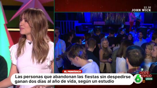 Las personas que abandonan las fiestas sin despedirse ganan dos días de vida al año, o eso es lo que aseguraba un falso estudio difundido por un diario satírico que, a pesar de no ser cierto, ha hecho reflexionar a medio mundo. Los zapeadores no han dudado en comentar en el programa su opinión sobre hacer 'bombas de humo' para irse de una fiesta.