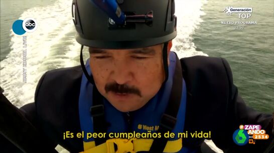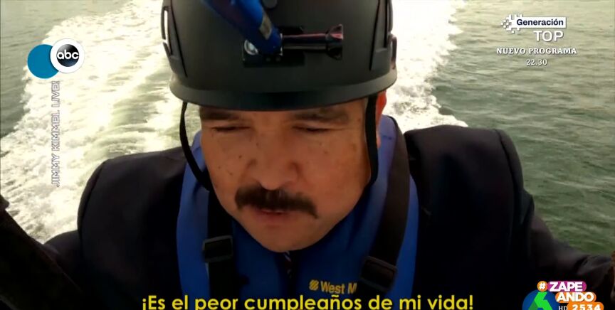 Jimmy Kimmel sorprende a Guillermo Rodríguez, colaborador de su show, con una sorpresa por su cumpleaños que no iba a olvidar nunca, una experiencia en 'parasailing'. "Menuda pu** mierda", expresaba el mexicano mientras se elevaba en el aire.