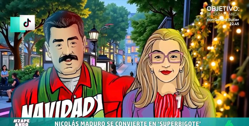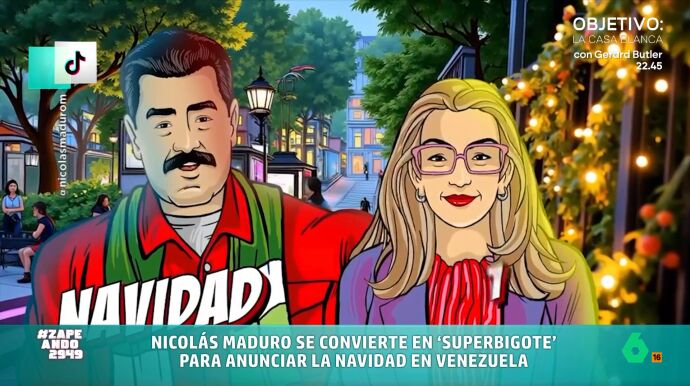 "Y los que tengan Spotify que lo pongan, que nosotros tenemos la versión con anuncios", añade, irónico, Miki Nadal. Maya cuenta que ddonde lo han dado todo es en la promoción que crearon para anunciar la Navidad. El anuncio está protagonizado por Súper Bigote, el alter ego, en forma de superhéroe, de Maduro.
