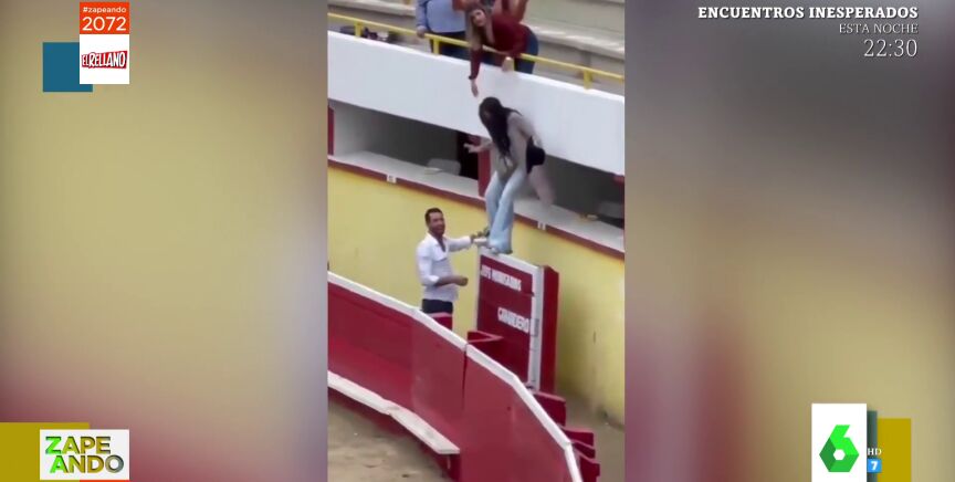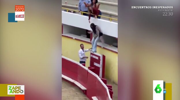 "Los asistentes a una corrida de toros cuentan con que alguien puede salir herido", con estas palabras presenta Cristina Pedroche su vídeo viral de hoy, en el que una pareja intenta bajar al suelo desde una de las barreras que delimitan la arena, pero lo hace de una manera un poco torpe. "Tenía más luces el traje de torero que estos dos juntos", comenta Lorena Castell tras ver las imágenes.