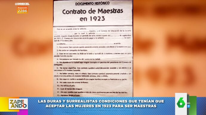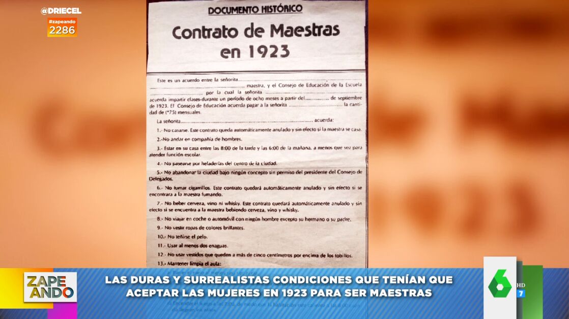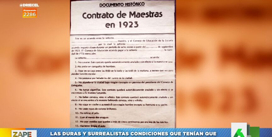 Por ejemplo, no podían casarse ni andar en compañía de hombres. Tampoco podían pasearse por las heladerías del centro de la ciudad ni viajar en coche ni automóvil con ningún hombre excepto con su padre o hermano. "¿Esto qué es Arabia Saudí?", se pregunta atónito Quique Peinado, que lee otra impactante condición: "Llevar al menos dos enaguas". Puedes ver el contrato en el vídeo de arriba.