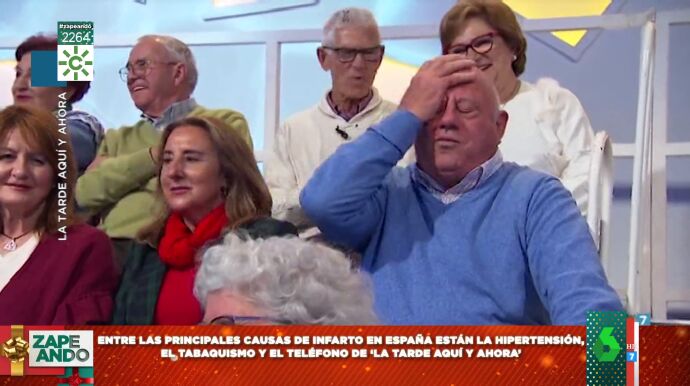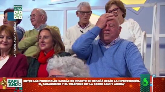Y, es que, como se puede ver en el vídeo principal de esta noticia, un hombre del público, que estaba dormido, se despertó por culpa del sonido del teléfono, que le hizo que se pegara un susto de muerte: "No has cascado de milagro, ¿eh?", bromeaba Juan y Medio en directo al ver su reacción y el nuevo color que adquiría su cara. "Acabó rojo el pobre hombre", comenta desde el plató de Zapeando María Gómez, que advierte a los señores que acudan de público que deberían "aprenderse a no quedarse dormidos en ese plató de televisión poque es casi tan peligroso como dormirse al volante". ¡Dale al play y no te lo pierdas!
