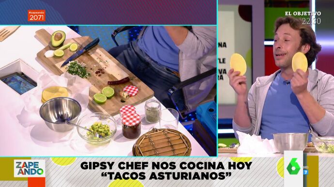 "Llega el momento de comer cositas ricas" anuncia Dani Mateo la llegada, una tarde más, del Gipsy Chef al plató de Zapeando, que en este programa se decanta por hacer una receta tan única como original: Los tacos asturianos. "Voy a asturianizar los tacos", comenta y muestra la combinación de aguacate con chorizo y chipotle que llevarán de relleno.