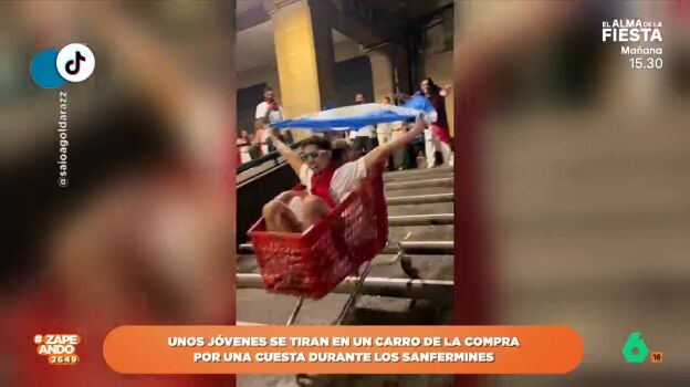 En San Fermín no basta con las emociones que se viven por las mañanas en los encierros, algunos necesitan experiencias más fuertes, como los protagonistas de este vídeo viral, que han protagonizado una de las locuras más divertidas de estos festejos. Como se puede ver en este vídeo, un joven se sube sobre un carro de la compra y se tira por una cuesta llena de escalones. Finalmente, el carro acaba volcando y el joven se pega una tremenda 'leche".