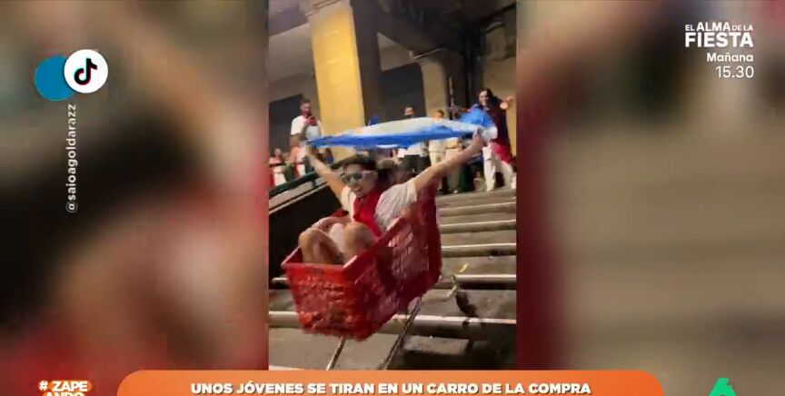 Un joven se vuelve viral en redes después de considerar buena idea tirarse subido en un carro de la compra por unas escaleras en San Fermín. "Nos gustaría decir que están todos bien, pero lo desconocemos", dice Miki Nadal.